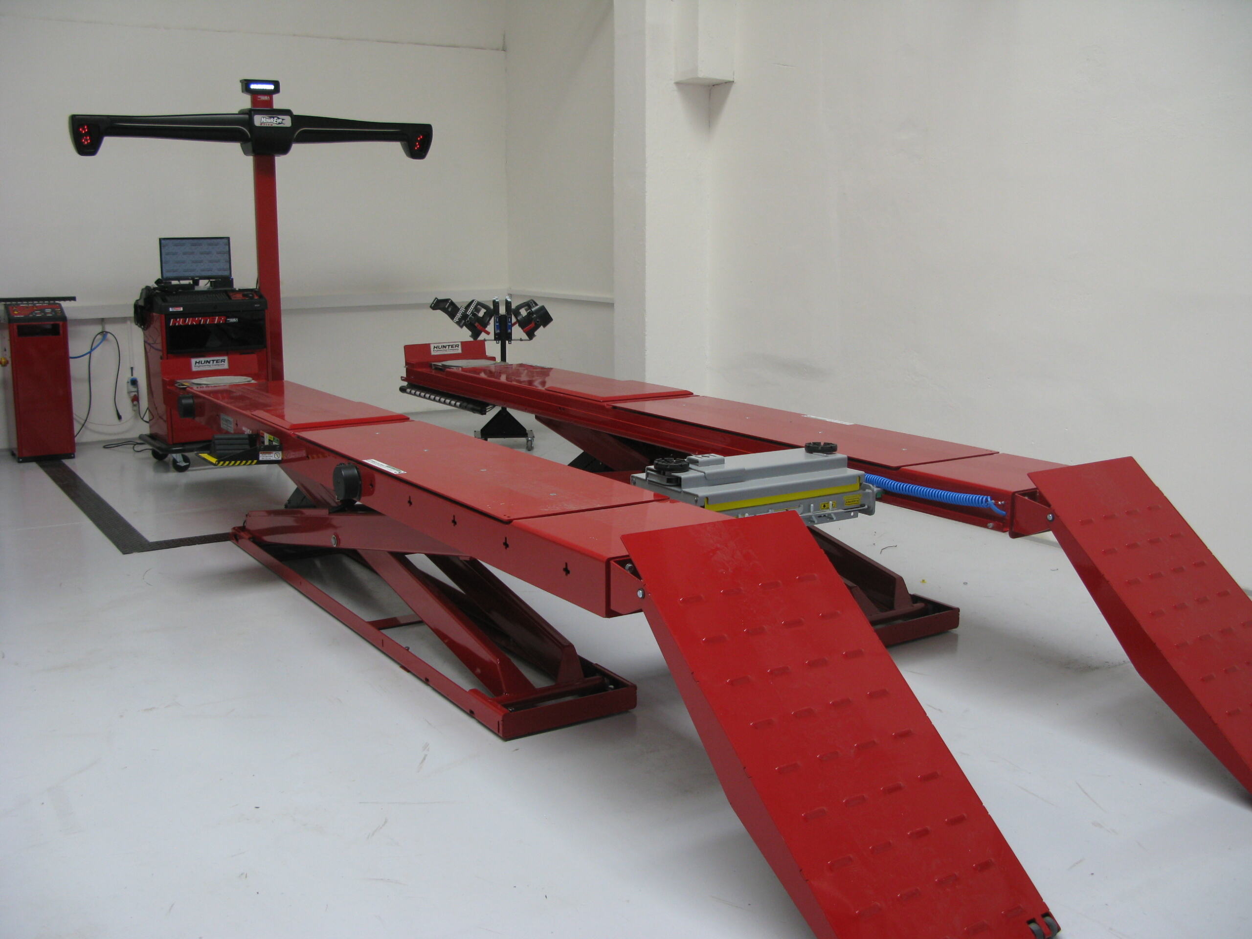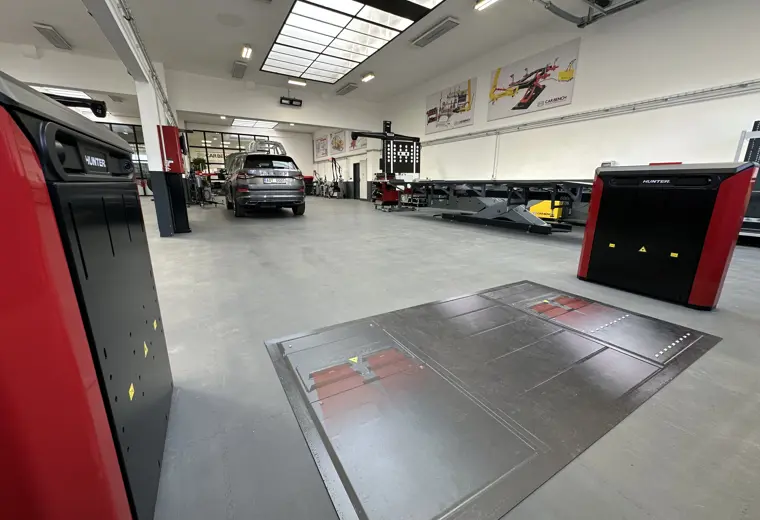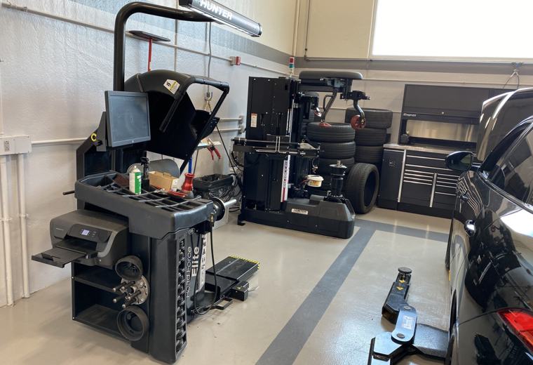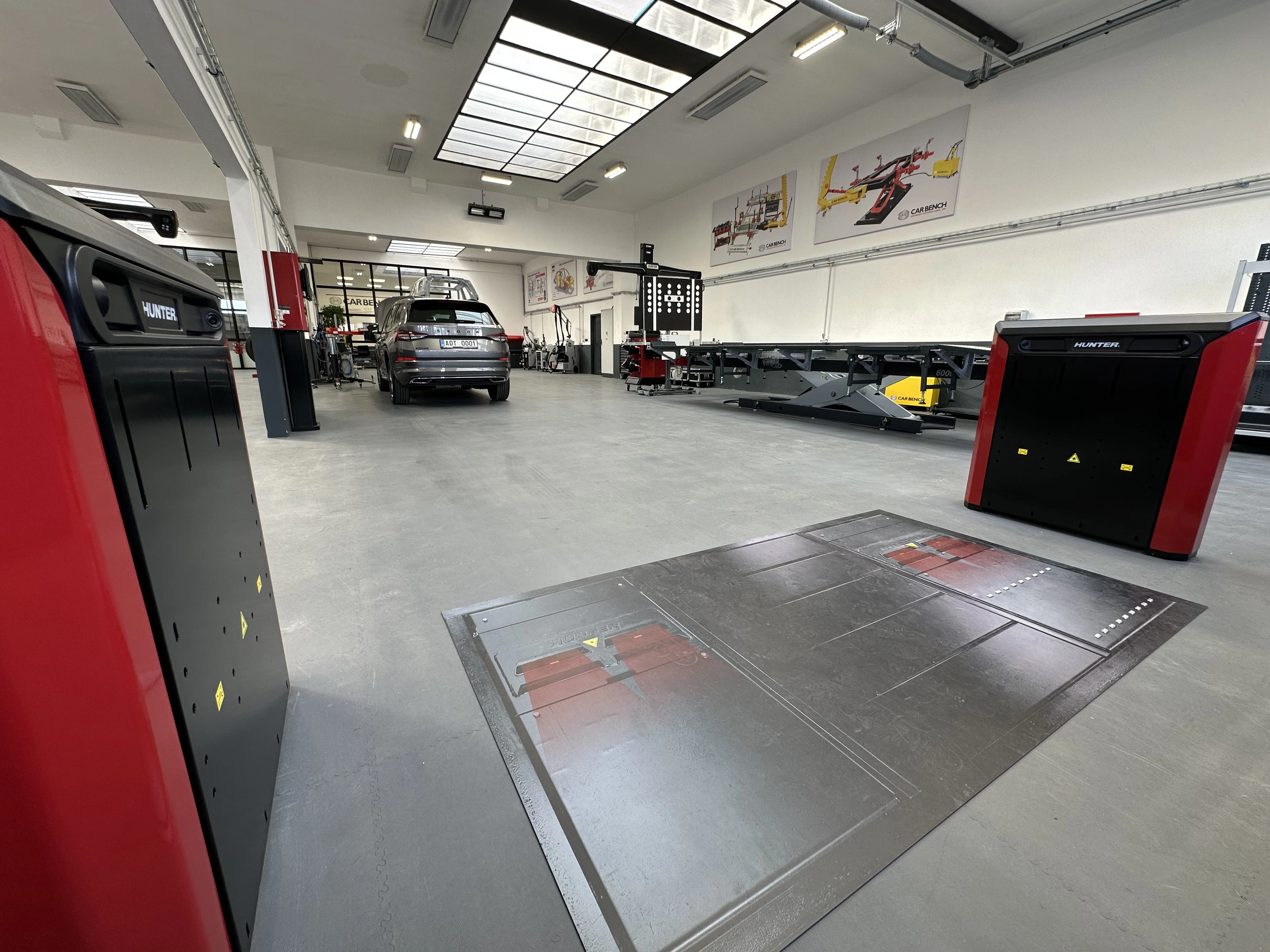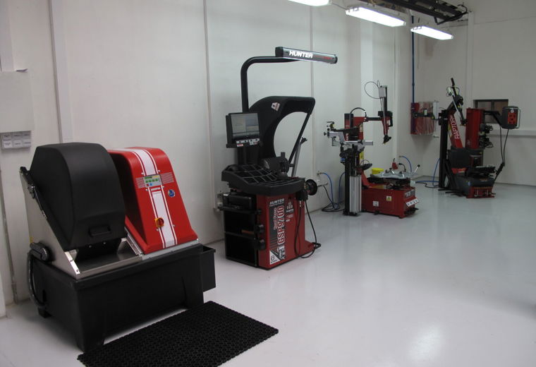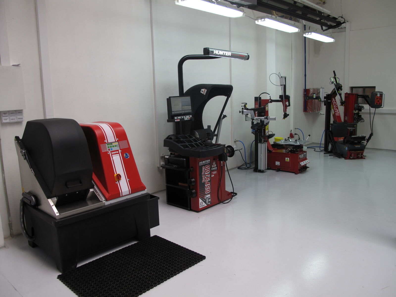 Zabudovaná inspekční linka Hunter Quick Check® Drive, měření geometrie Hunter Hawkeye Elite® s nůžkovým zvedákem Hunter RX doplňuje několik různých vyvažovaček a montážních strojů Hunter.