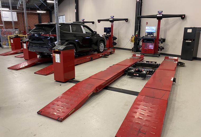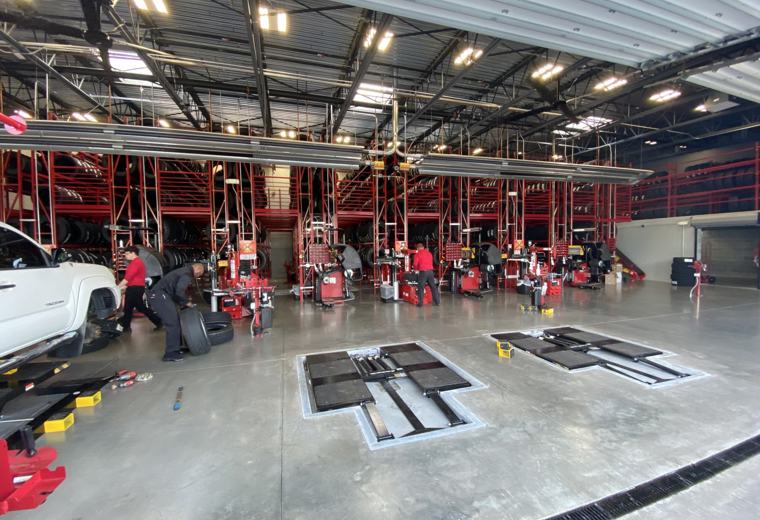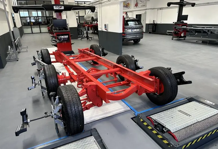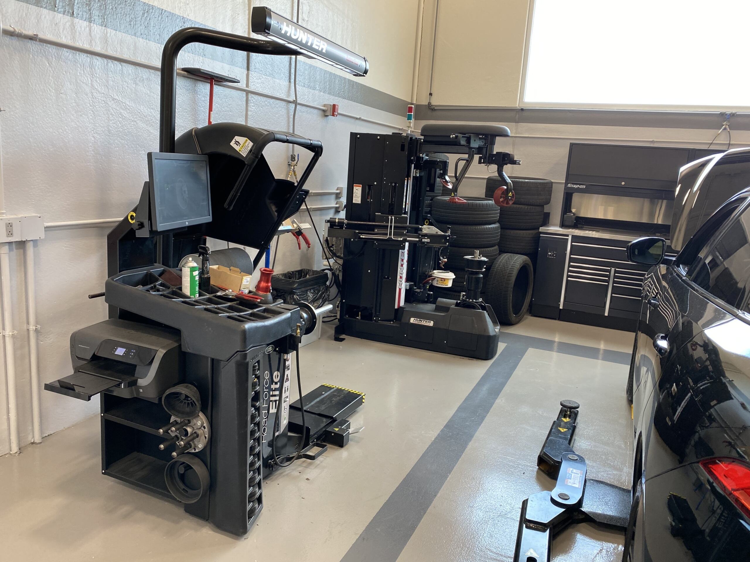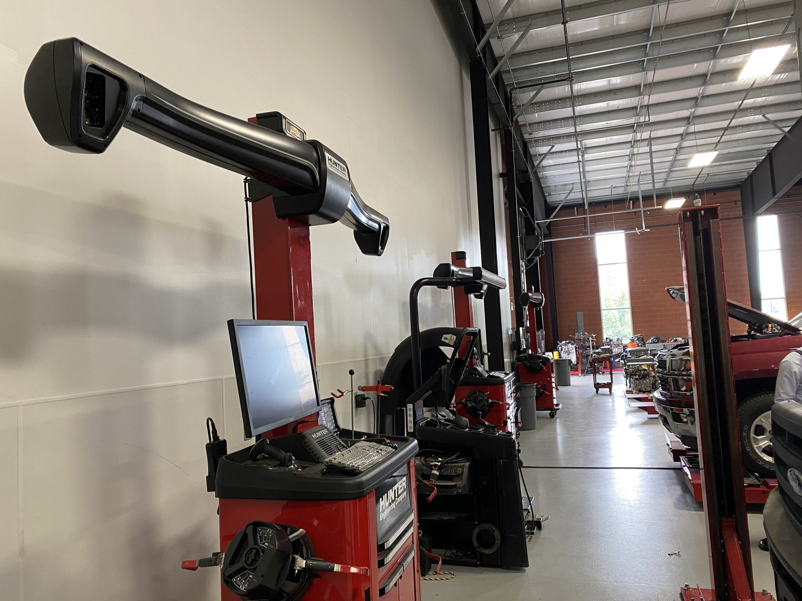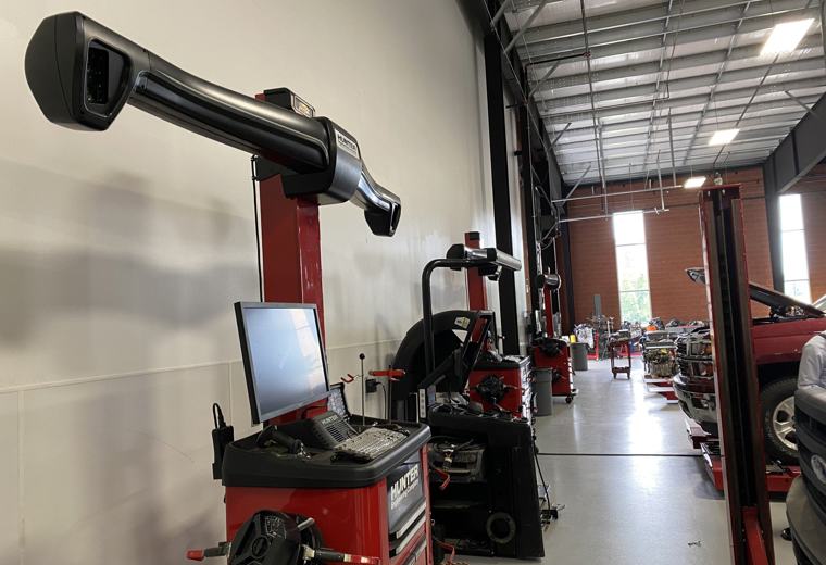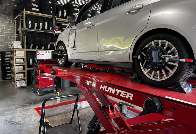Zabudovaná inspekční linka Hunter Quick Check® Drive, měření geometrie Hunter Hawkeye Elite® s nůžkovým zvedákem Hunter RX doplňuje několik různých vyvažovaček a montážních strojů Hunter.