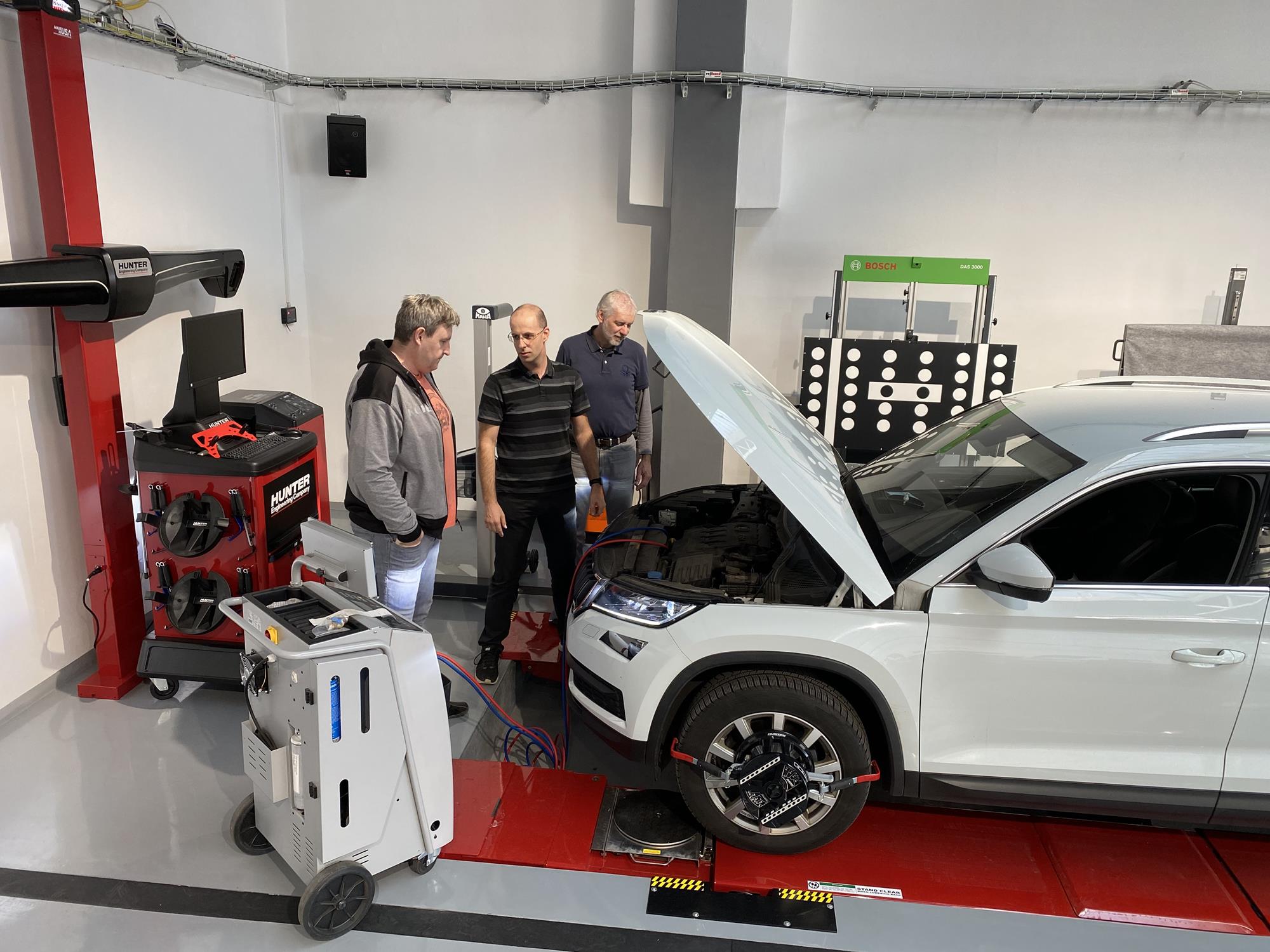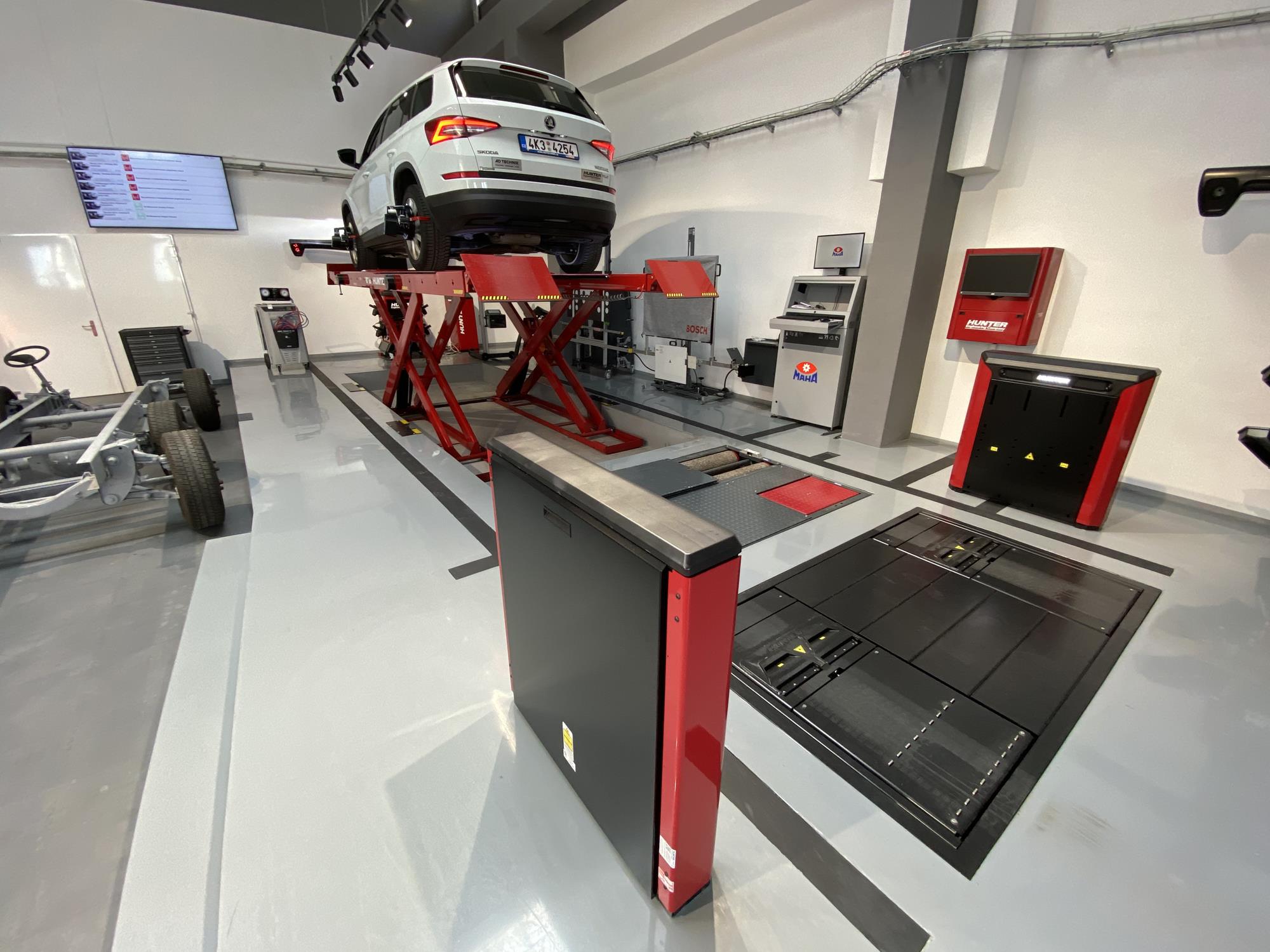 V této části školíme také seřízení světel a kalibrace systémů ADAS na stroji Bosch DAS 3000. Součástí je i brzdová zkušebna a zkušebna zavěšení MAHA a také zařízení pro servis klimatizací Waeco.